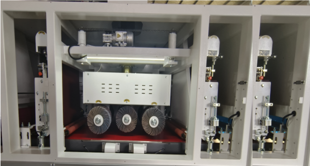 Внутренняя структура 1000MRRPR состоит из трех комплектов абразивных лент + шести роликовых щеток, образующих систему обработки. Первая и вторая абразивные ленты используются для первоначального удаления заусенцев с поверхности заготовки; третий этап с шестью роликовыми щетками выполняет щеточную обработку, обеспечивая тщательное удаление заусенцев без повреждения поверхности.