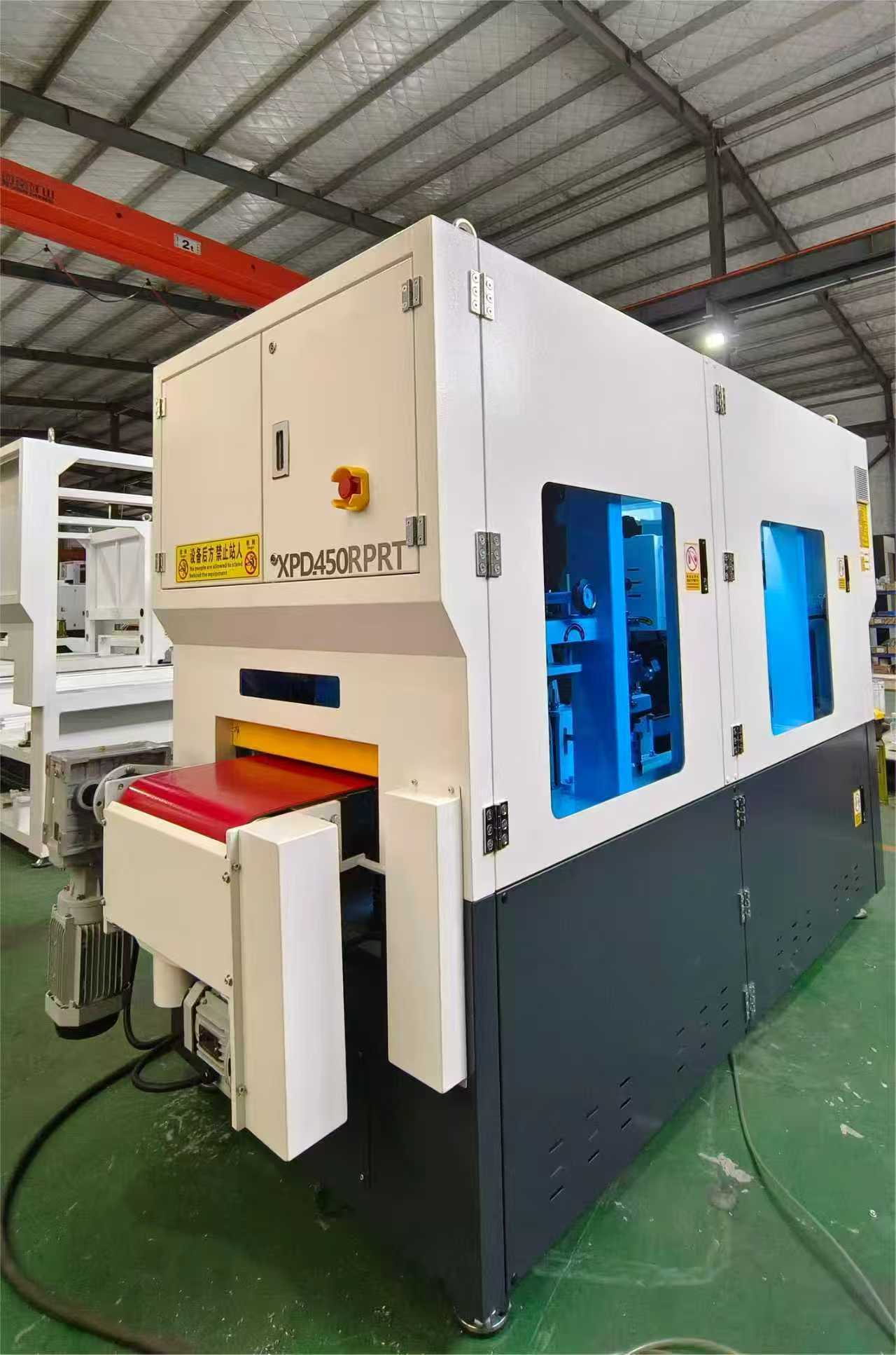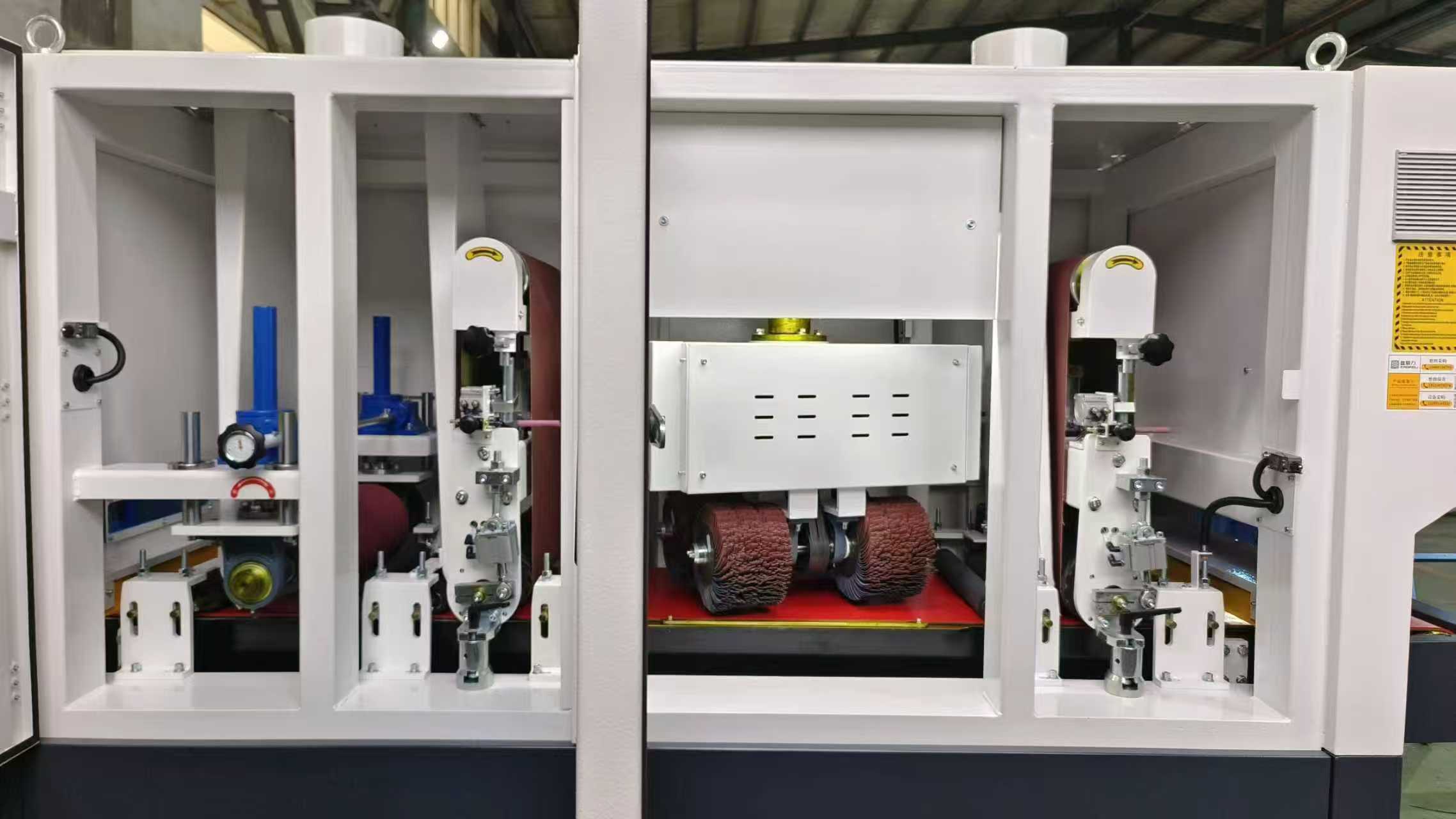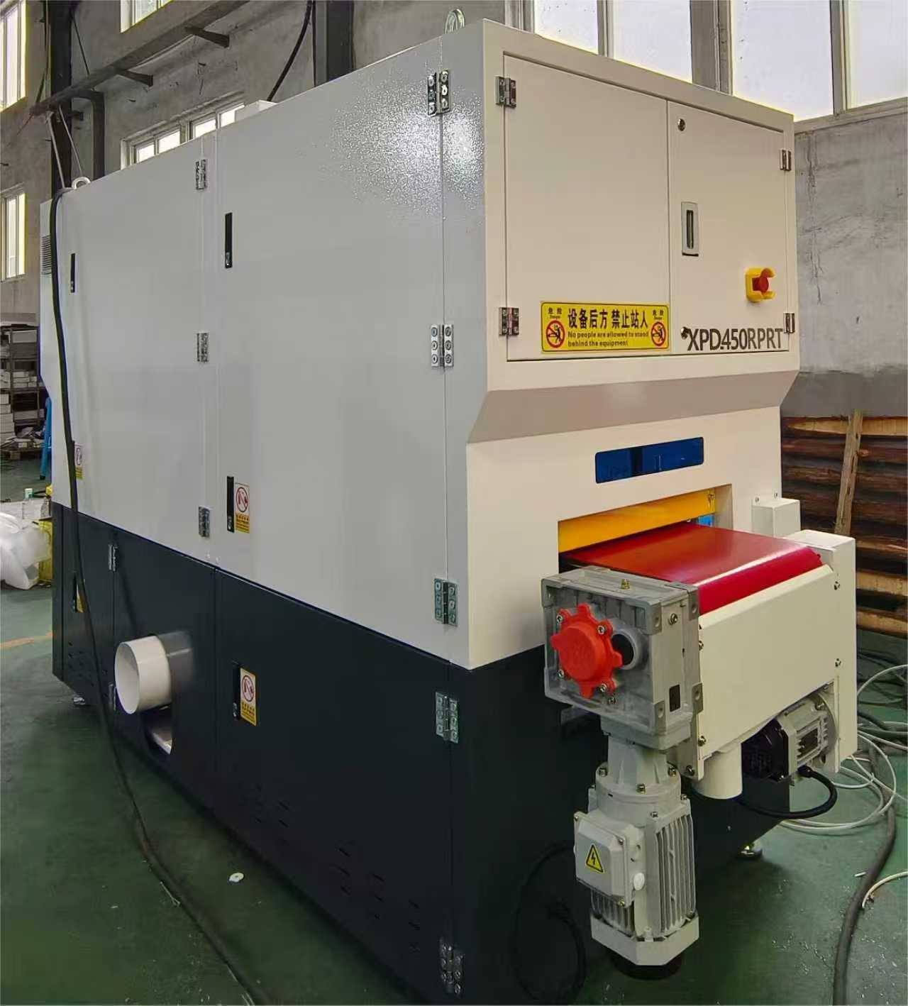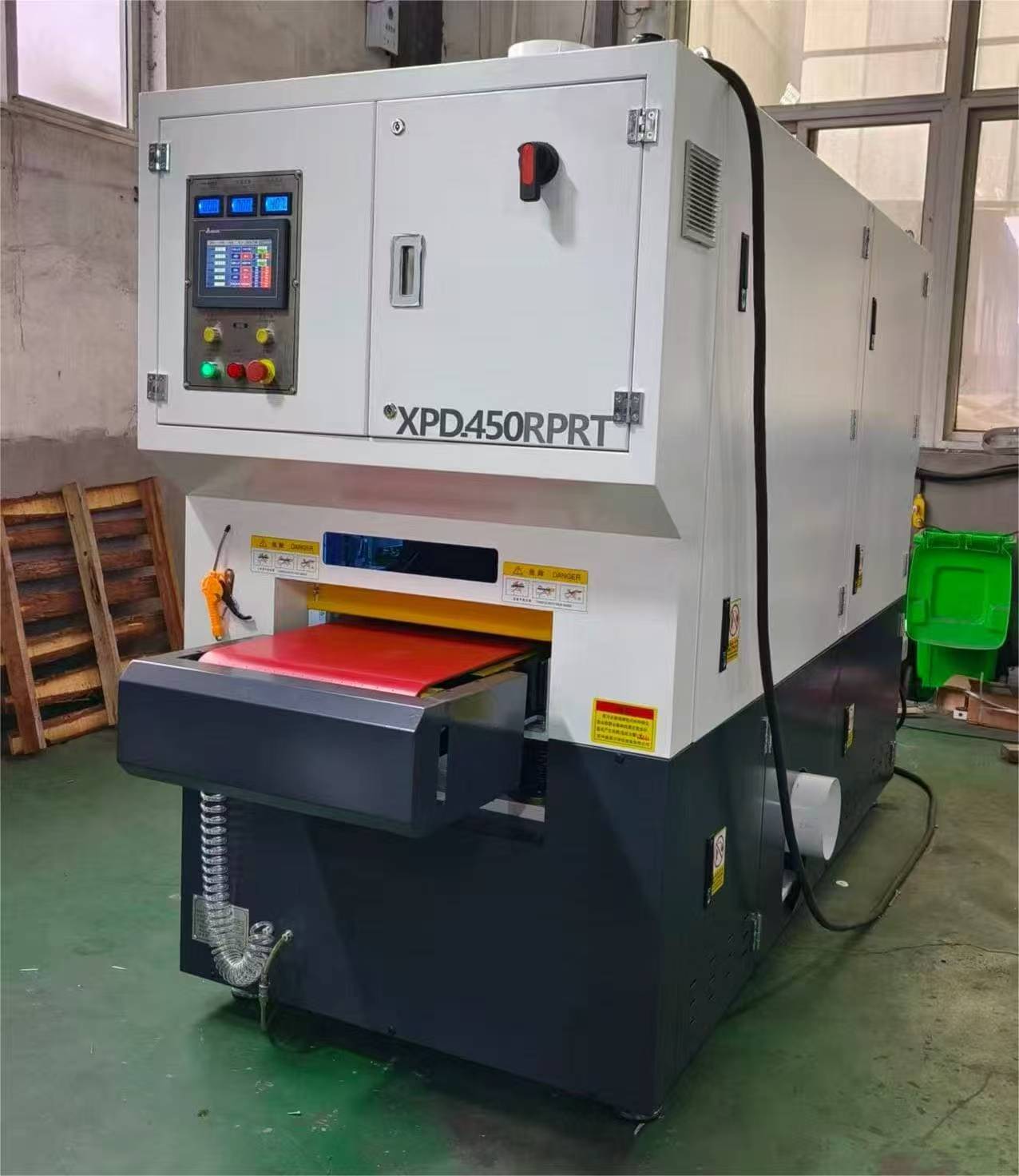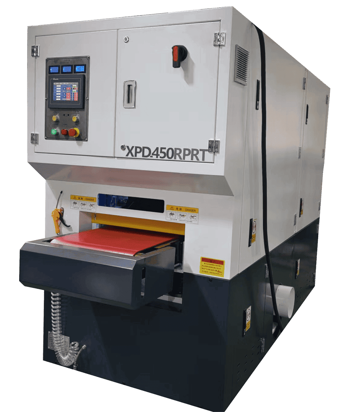 Внутренняя структура 450RPRT состоит из одного комплекта абразивной ленты + четырех роликовых щеток + одного комплекта абразивной ленты + одного полировального ролика, образующих четырехступенчатую систему обработки. Первая абразивная лента используется для первоначального удаления заусенцев с поверхности заготовки; второй этап с четырьмя роликовыми щетками осуществляет щеточную обработку, обеспечивая сквозное удаление заусенцев без повреждения поверхности; второй комплект абразивных лент обеспечивает дальнейшее тонкое шлифование для улучшения плоскостности поверхности; и, наконец, полировальный валик осуществляет прецизионную полировку, делая поверхность гладкой, однородной и визуально изысканной. Благодаря хорошо продуманной конструкции станок для отделки металла обеспечивает эффективную, стабильную и непрерывную обработку поверхности.