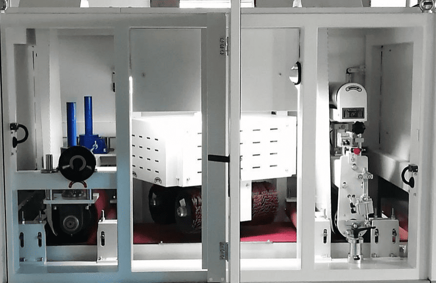 Внутренняя структура 800RPT состоит из одного набора абразивных лент + четырех роликовых щеток + одного полировального ролика, образующего систему обработки. Первая абразивная лента используется для первоначального удаления заусенцев с поверхности заготовки; второй этап с четырьмя роликовыми щетками осуществляет щеточную обработку, обеспечивая тщательное удаление заусенцев без повреждения поверхности; и, наконец, полировальный валик осуществляет прецизионную полировку, делая поверхность гладкой, однородной и визуально изысканной. Благодаря хорошо продуманной конструкции станок для отделки металла обеспечивает эффективную, стабильную и непрерывную обработку поверхности.