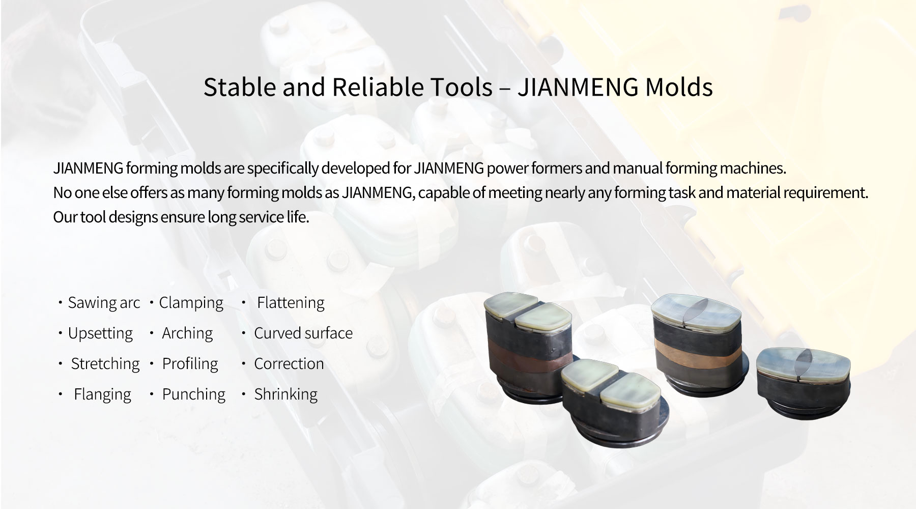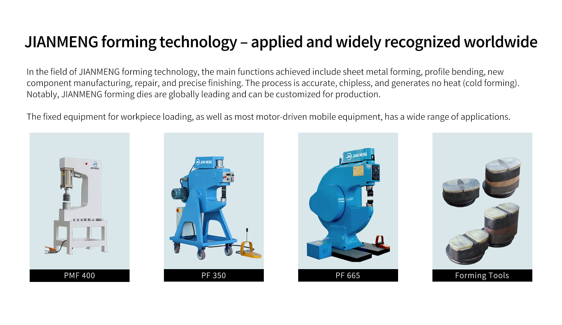 Технология Jianmeng обеспечивает точное, без чип -холодного формирования металлических листов и профилей с минимальным шумом. Машина формирования Kraftformer может использоваться для изгиба профилей, формирования металлических листов, производства новых деталей, а также для ремонта и точно исправления компонентов. Машина оснащена различными инструментами, которые могут быть установлены и заменены в течение нескольких секунд, чтобы адаптироваться к различным задачам. Эта интеллектуальная технология Jianmeng является во всем мире.